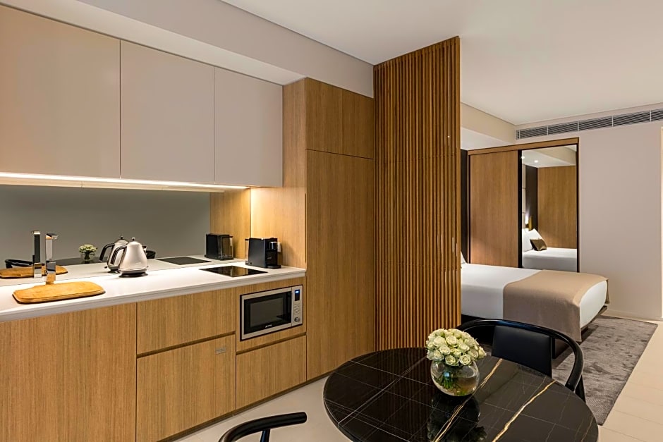 This Deluxe Studio Suite features a balcony, stovetop and microwave.
